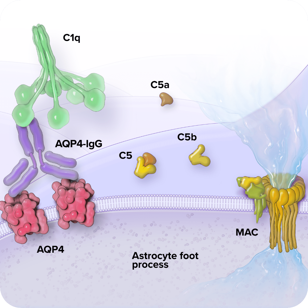 Anti-AQP4 antibody binding to AQP4 activates complement. When terminal complement is activated, the complement component C5 is cleaved into C5a and C5b.